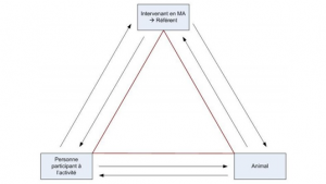 Selon Véronique SERVAIS (Psychologue, professeur en anthropologie de la communication à l’Université de Liège en Belgique) la médiation par l’animal, va permettre de travailler divers aspects : thérapeutiques, sociaux, pédagogiques, éducatifs, moteurs et cognitifs, par le biais d’une relation construite avec l’animal. Elle permet à un professionnel de rentrer dans une relation de confiance avec son bénéficiaire. Celui-ci pourra travailler son mieux-être grâce au rapport du vivant. Ce lien est basé sur le principe de la relation triadique établit par Véronique Servais repris dans le schéma suivant :