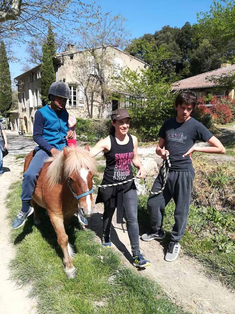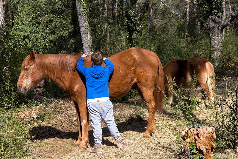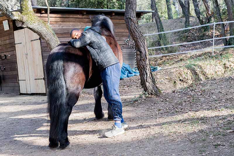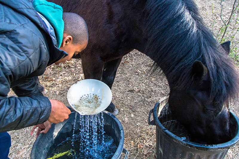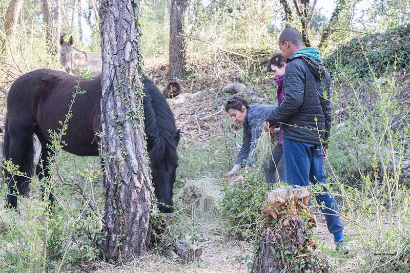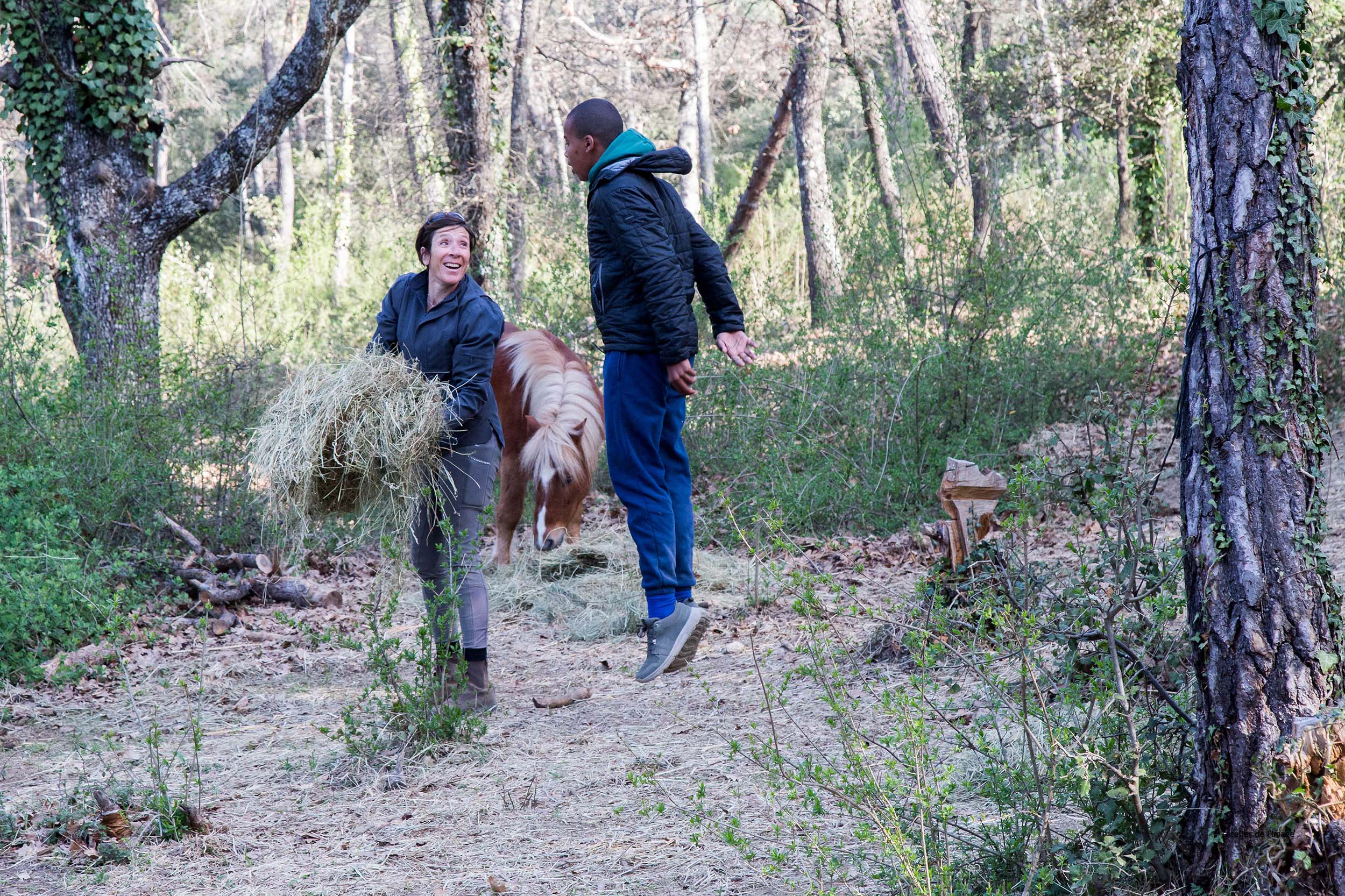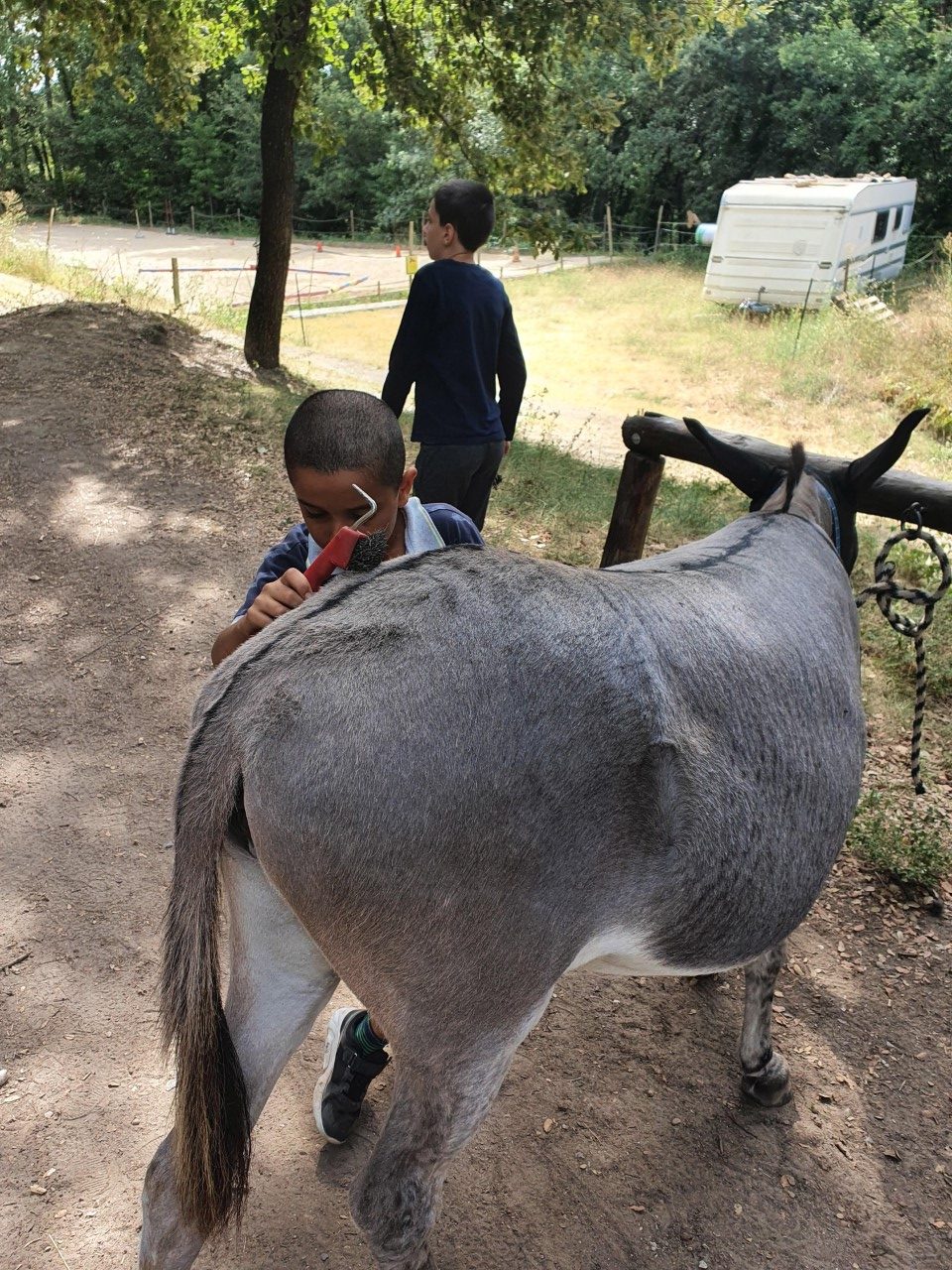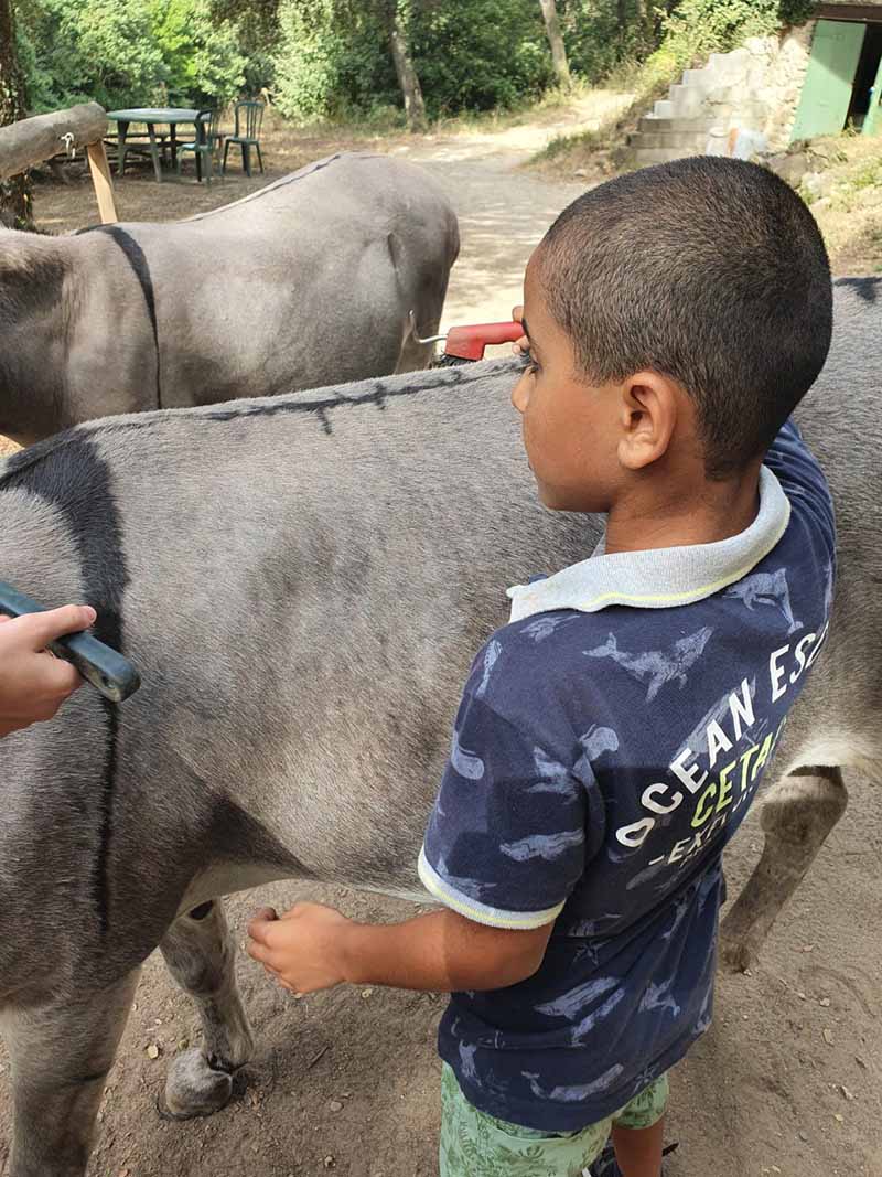 Nous avons 6 animaux : 2 poneys, 2 ânesses et 2 chevaux éduqués et entraînés pour le travail demandé. Les enfants doivent s’en occuper quotidiennement c’est-à-dire les nourrir, s’assurer qu’ils ont de l’eau propre à disposition et qu’ils ne souffrent d’aucun manque de soin même pas le manque de liberté car ils évoluent sur une superficie de 2 hectares.