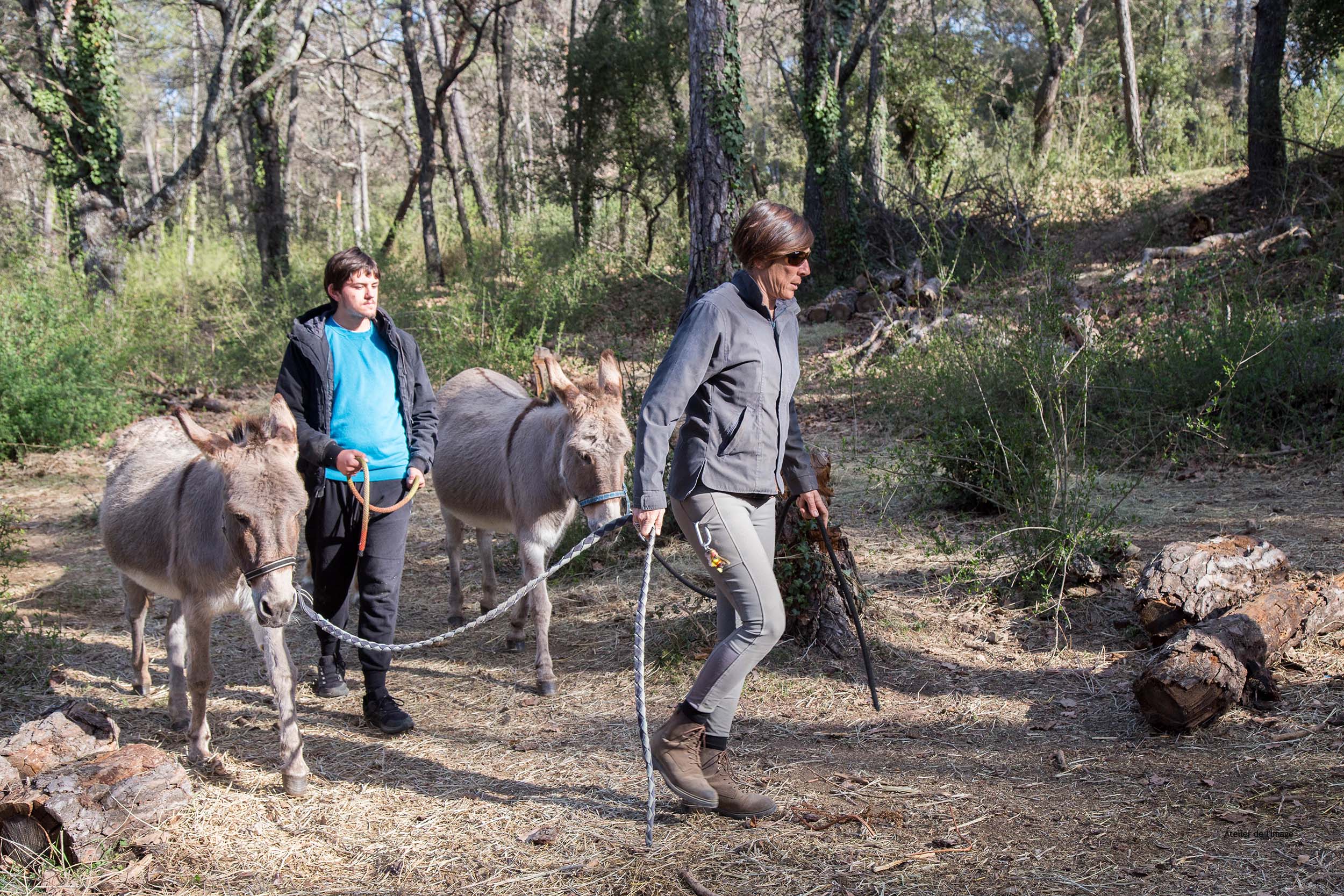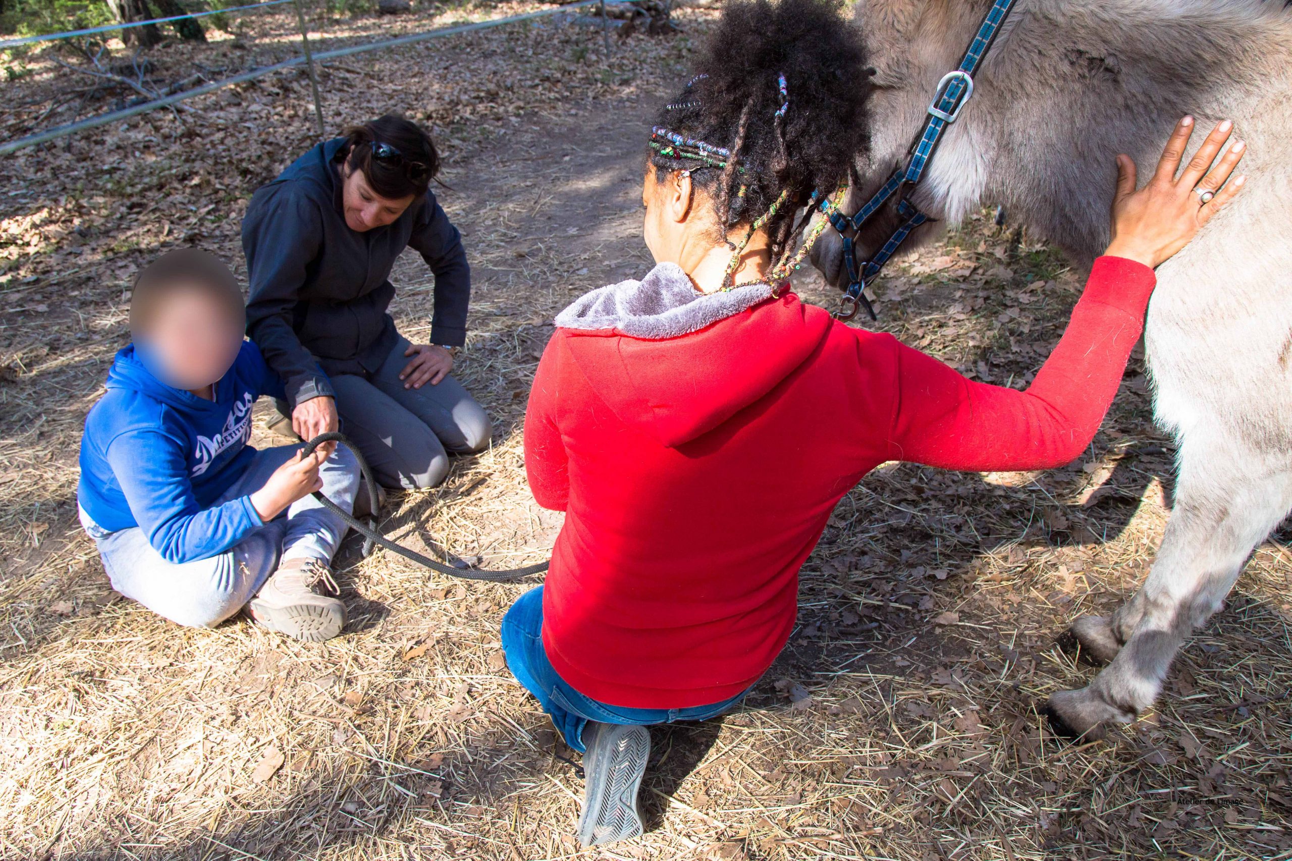 A l’aide de licols, nous emmenons les ânesses à la barre d’attache et dispensons tous les soins nécessaires telles que brossage du poil du corps et de la tête et le curage des sabots. Les enfants regardent souvent en détail toutes les parties anatomiques que nous nommons. Nous encourageons la libre interaction entre les animaux et et les jeunes tant que cela reste dans le respect et la non violence.