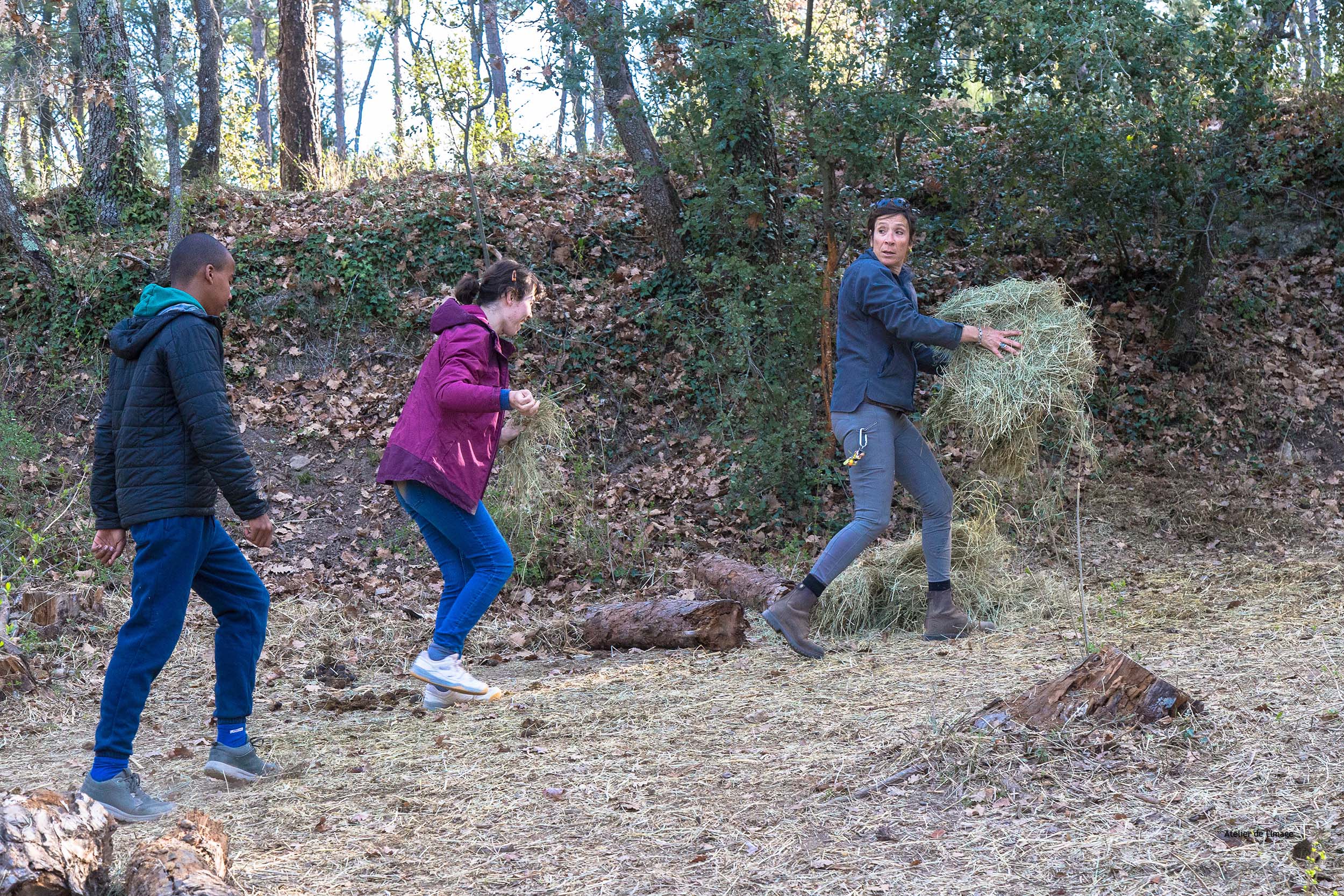 Le premier contact avec les animaux se fait par la distribution de leur nourriture c’est-à-dire le foin et l’apport de céréales. Les enfants et les intervenantes rentrent dans leur parc à ce moment là, et nous leur laissons le temps de regarder les chevaux alors immobiles manger. Nous commentons parfois les relations qui unissent un cheval à un autre lorsqu’ils se déplacent. Nous nous posons ensemble dans la colline où ils vivent.